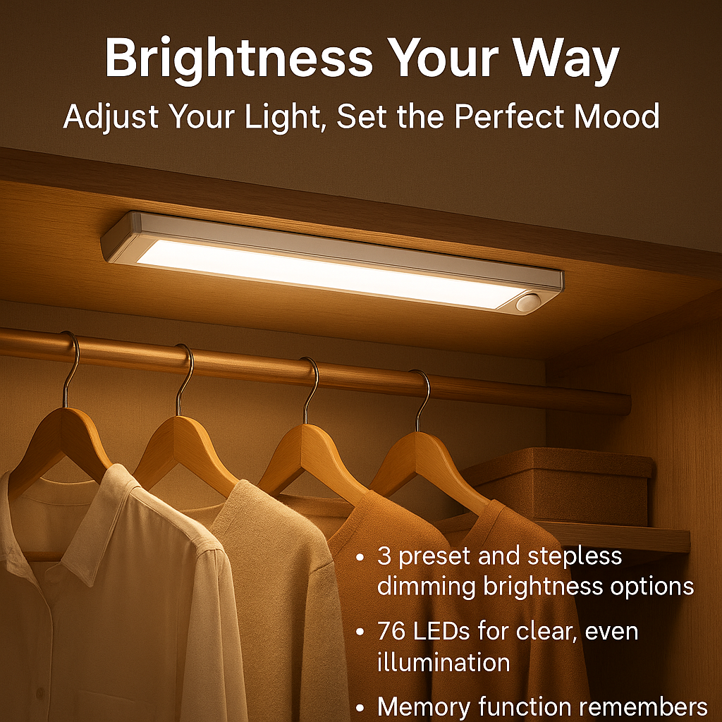 Tired of fumbling in the dark? The 76 LED Motion Sensor Cabinet Light automatically illuminates your space when it detects movement within 10 feet and 120°. No switches, no effort — just instant, hands-free lighting that turns off after 25 seconds of inactivity to save energy.