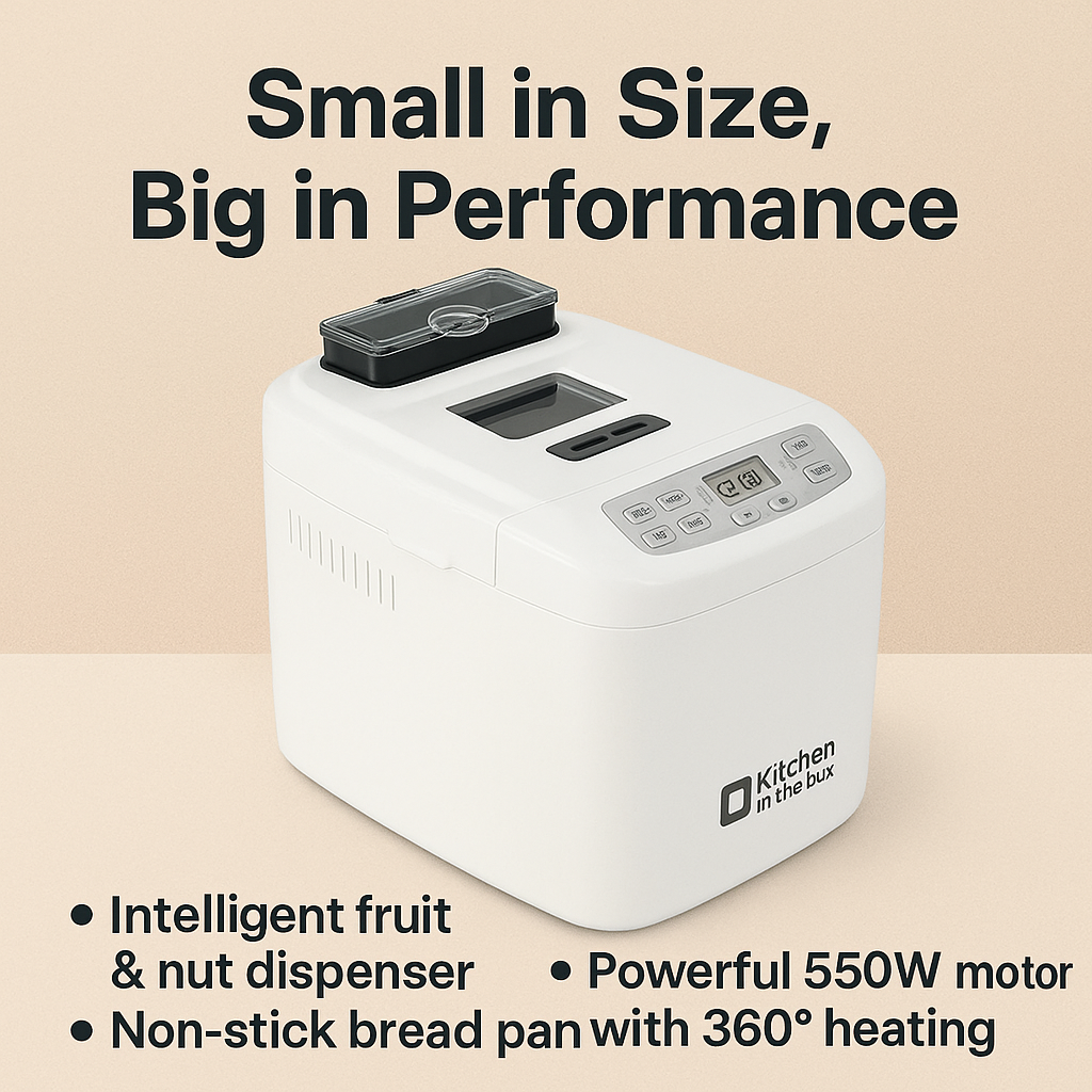 The Kitchen in the Box Bread Maker is designed to fit seamlessly into any kitchen. With its intelligent fruit and nut dispenser, non-stick bread pan, and powerful 550W motor with 360° even heating, you get professional-quality results in a sleek, space-saving design. It’s not just an appliance—it’s your new kitchen companion.